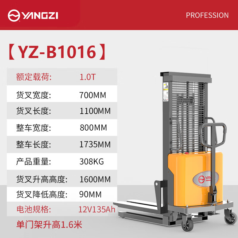 揚子電動叉車YZ-B1016半自動堆高車1噸升高1.6米,安全剎車功能卸貨更方便